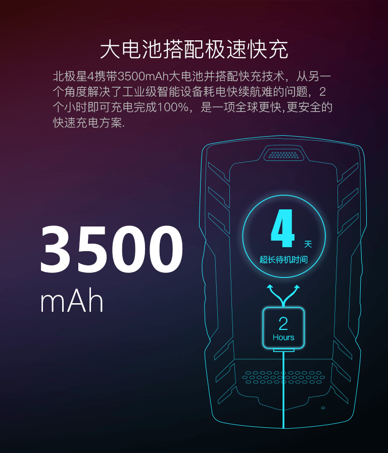 北極星4攜帶3500mAh大電池并搭配快充技術,從另一個角度解決了工業級智能設備耗電快續航難的問題,2個小時即可充電完成100%,是一項全球更快,更安全的快速充電方案.