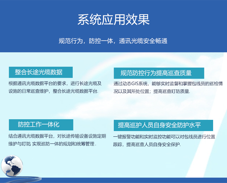打造長(zhǎng)途光纜基礎(chǔ)信息大數(shù)據(jù),巡查盯防維護(hù)工作的規(guī)范化,通訊網(wǎng)絡(luò)安全防控一體化。
